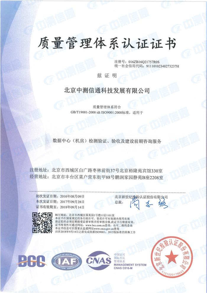 截止2019年8月7日,北京中测信通科技发展有限公司已为数据中心机房获得22张认,《信息系统机 房动力及环境系统认》6张,《数据中心场地基础设施认》16张。