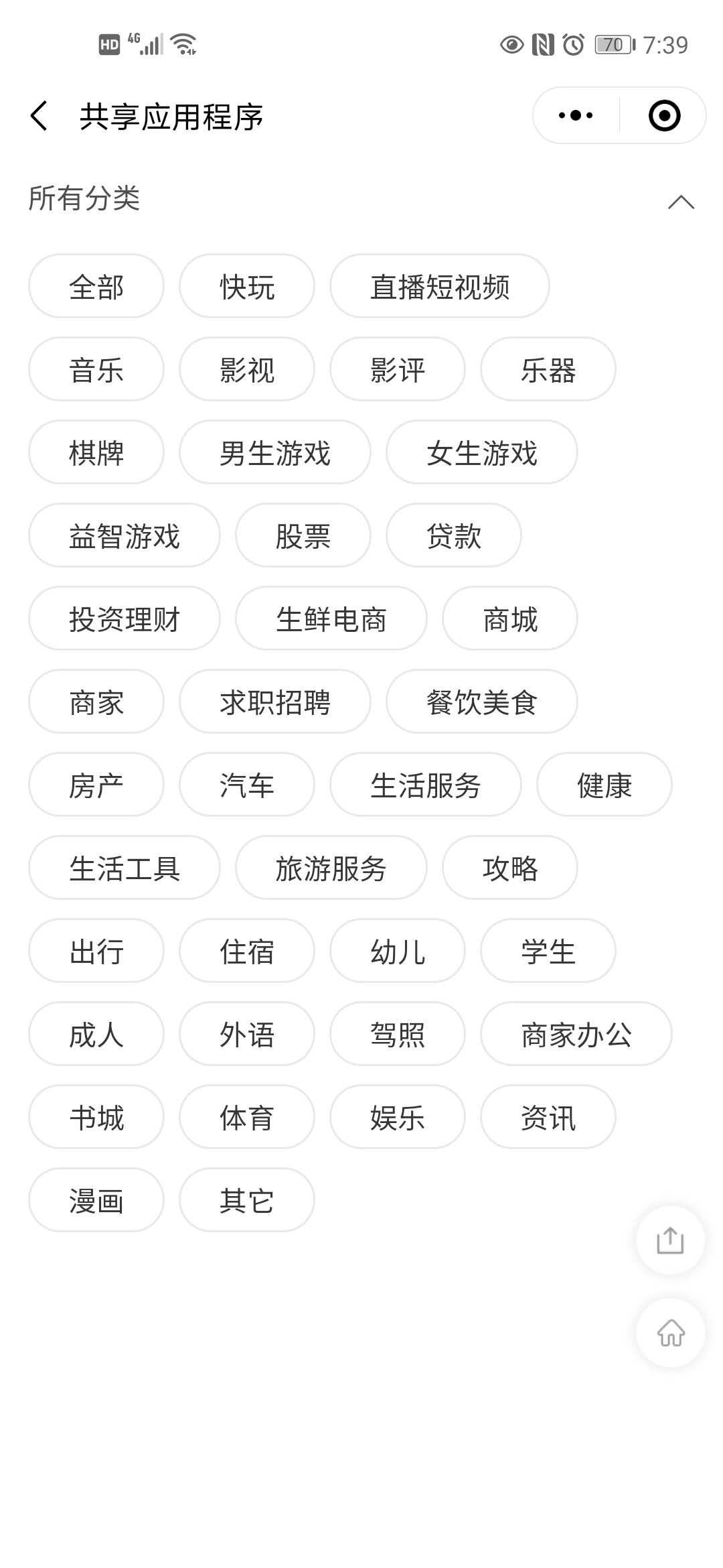 共享应用程序,是一个便民的微信小程序导航程序。只要你收藏本程序,即可实现微信全网小程序一码俱全。无论您是想找小游戏、学习、娱乐八卦、小视频、影视等小程序,都可以放心的在“共享应用程序”导航里查找。