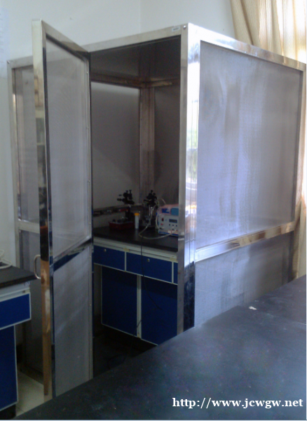 用途:运用法拉第电磁屏蔽原理,对高精度的电子设备起到消除和减弱电磁干扰,提高测量精度的作用。能将整张工作台放置进去,方便操作,带有接地线接口。